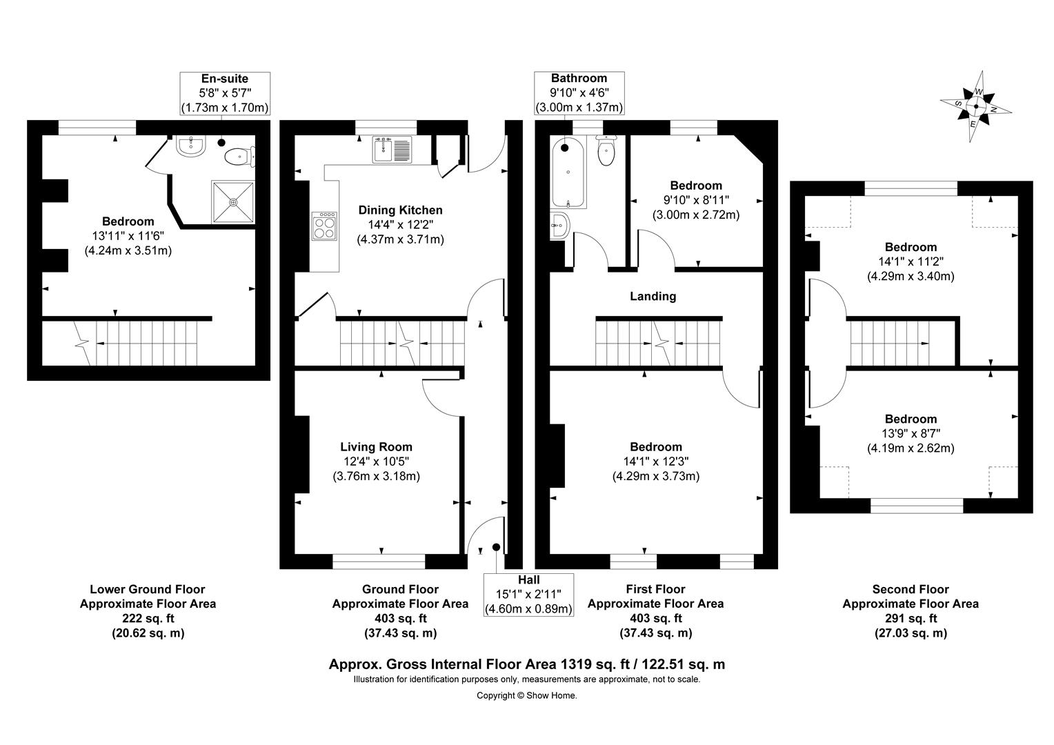 The first floor offers two further double bedrooms and a sleek, contemporary house bathroom with a luxurious bath. On the second floor, two additional double bedrooms provide plenty of space for a growing family, guests, or home working.