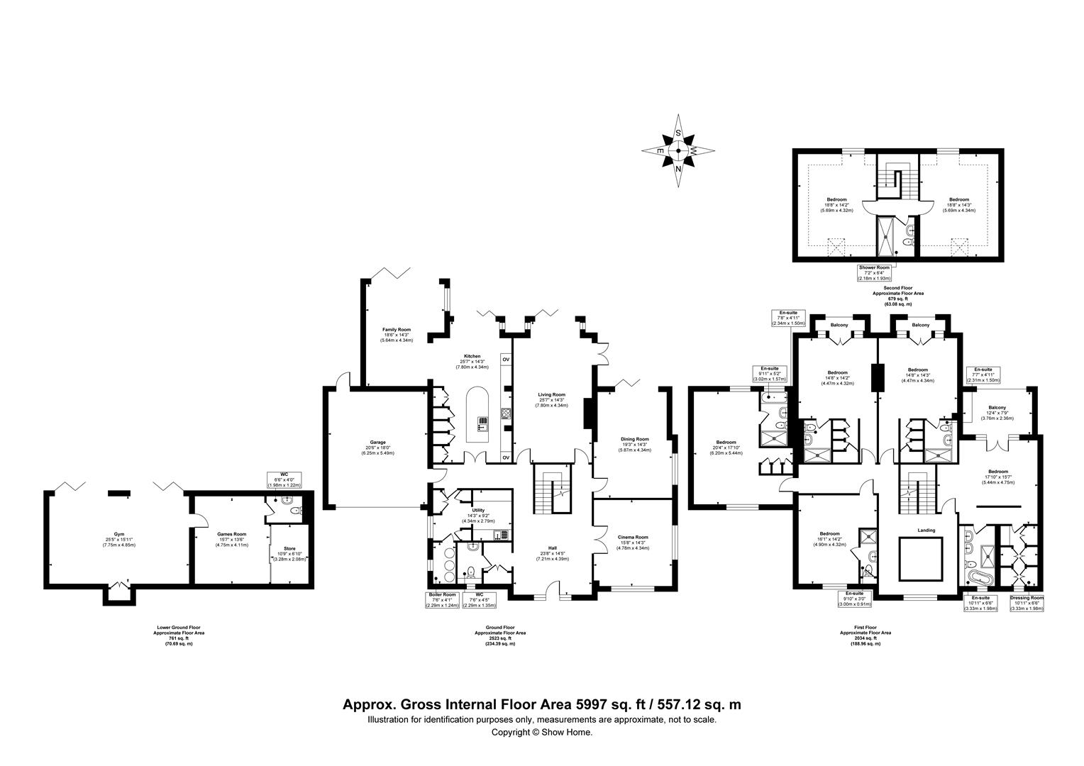 On the first floor, you’ll find five well-appointed double bedrooms, each with its own en suite. The principal bedroom enjoys a private balcony and a walk-in dressing room, while two additional bedrooms also feature balconies. All bedrooms offer excellent fitted storage.
