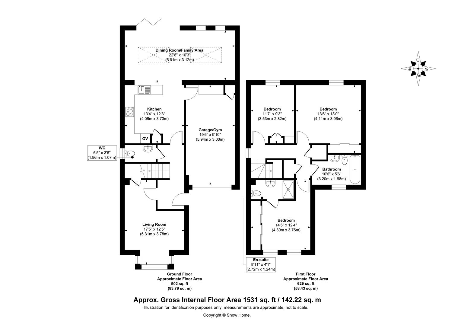 On the first floor, you'll find a luxurious primary suite with an en-suite shower room and built-in wardrobes. There are also two generously sized double bedrooms and a modern family bathroom.