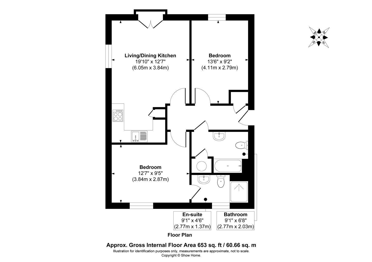 The master bedroom is a generous double with a radiator and large window, complemented by a contemporary en-suite shower room. The en-suite has been recently updated and features a walk-in shower, WC, washbasin, tiled flooring, radiator, and a frosted window. The second bedroom is another well-proportioned double with a radiator and window.