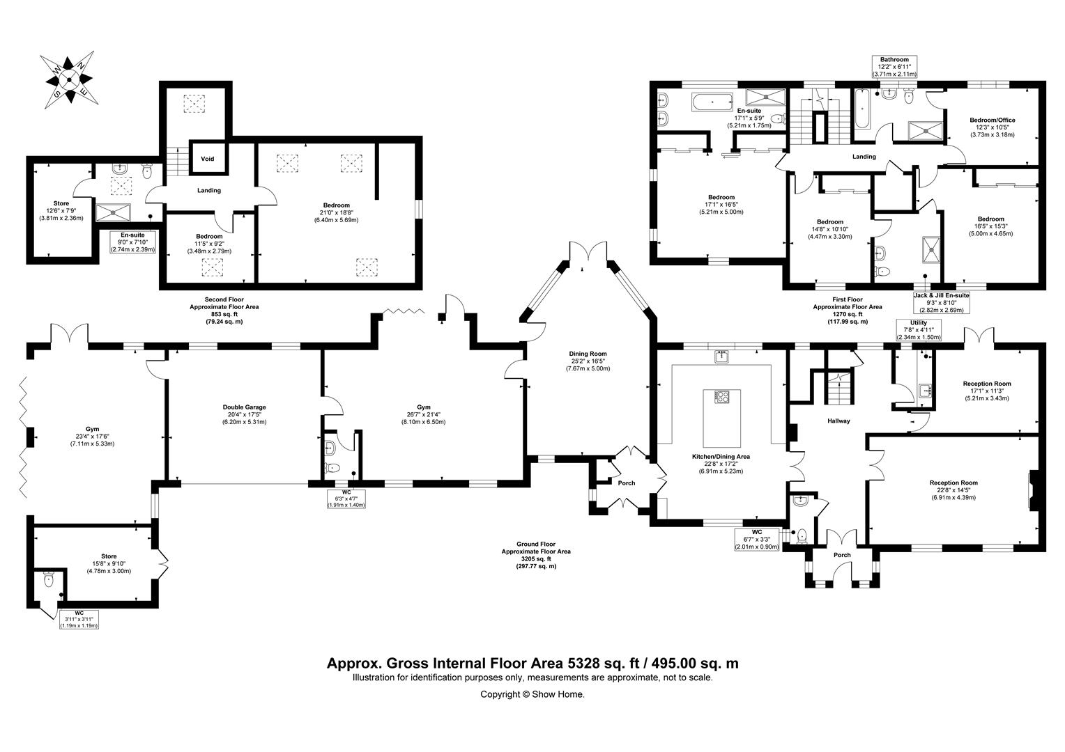 On the first floor, you will discover four elegant double-bedroom suites. The principal suite features fitted furniture and a luxurious En Suite bathroom with a separate shower and bath, complemented by two further modern bathrooms on this floor.