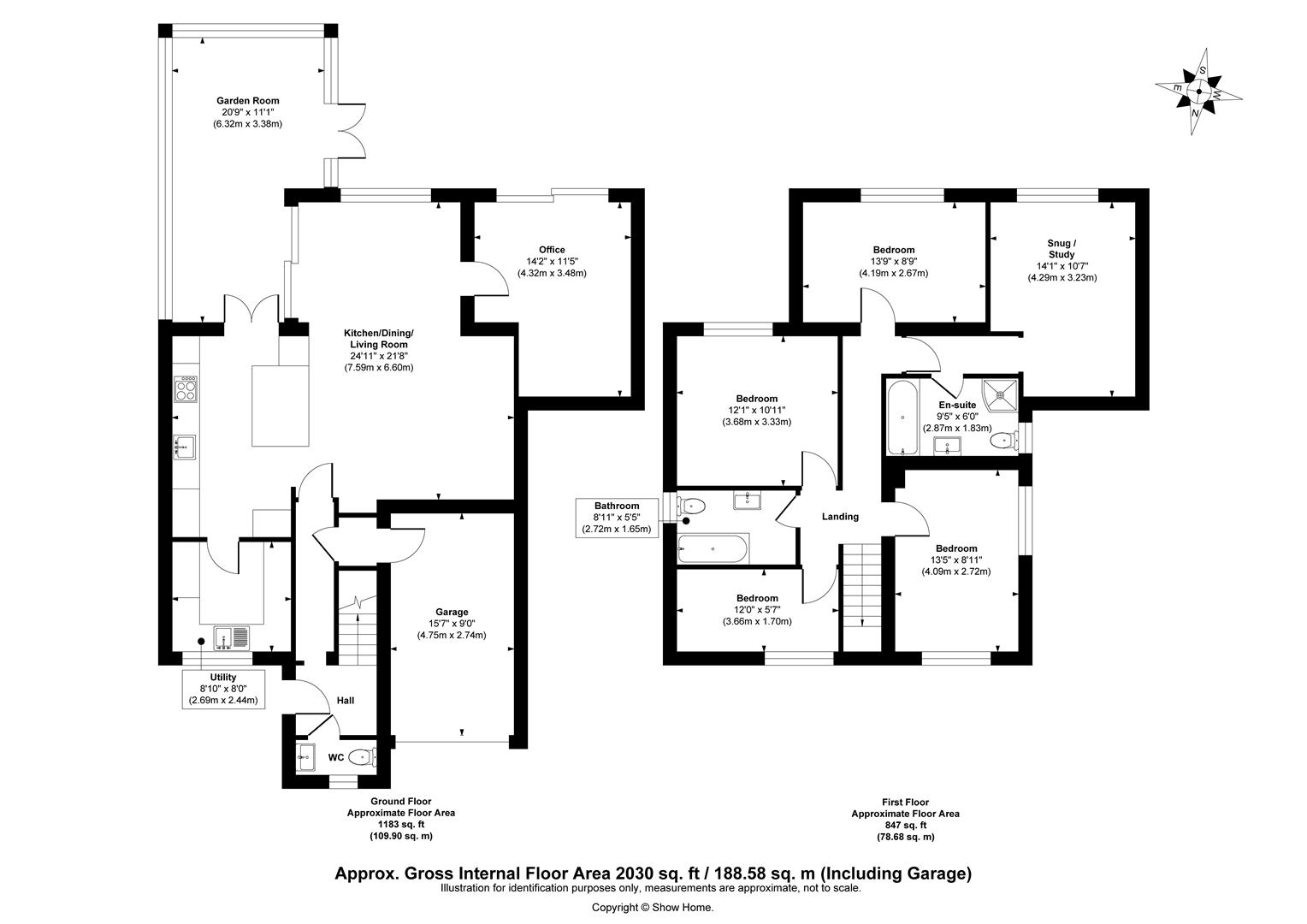On the first floor, you’ll find five bedrooms, one of which includes an en-suite bathroom, along with a stylish family bathroom.