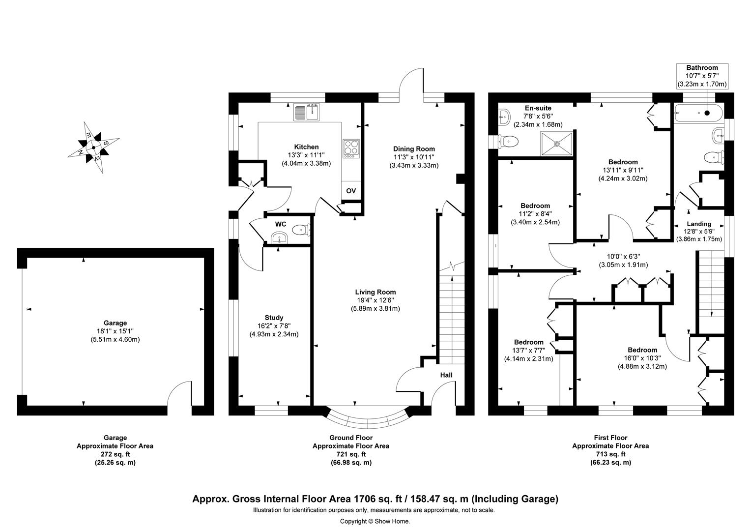 Upstairs, the home continues to impress with a well-proportioned layout. The primary bedroom includes a private ensuite shower room, while three further double bedrooms all benefit from built-in storage. A family bathroom with a bathtub serves the remaining bedrooms.